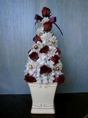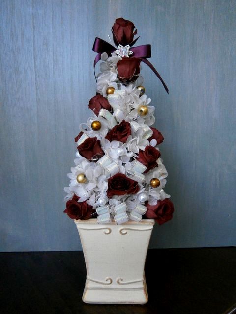 三角ツリーにお花がいっぱい。お花ひとつひとつが天使だったら、本当に天使の歌声が聞こえてきそうですね。ハイドランジアやキラキラリボン、ボールも入ってカワイイです。バラが大人っぽい色なので、これから秋へむかってのディスプレイにいかがでしょうか。渋めのクロスで秋を演習。クリスマスにはサンタさんやスノーマン、オーナメントなどを置いて楽しんでね。新築祝やお誕生日プレゼントなど、お祝におすすめです。