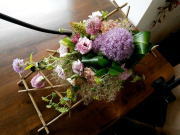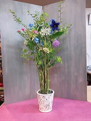 竹で枠組みを作り、アシンメトリーの花束に仕上がっています。ギガンジウムが少し重かったですが、とてもバランスよく組まれています。初夏の花束らしく涼やかな雰囲気がでていますね。